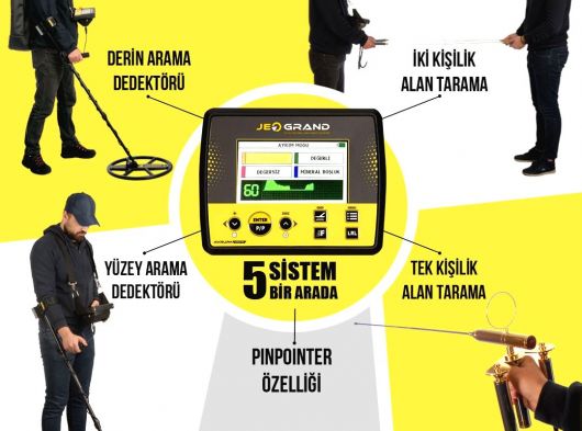 KISACASI SİZ 1 ADET DERİN ARAMA DEDEKTÖRÜ, 1 ADET TEK PARA DEDEKTÖRÜ, PİNPOİNTER CİHAZI, EKRANLI TEK KİŞİLİK ALAN TARAMA CİHAZI, EKRANLI İKİ KİŞİLİK ALAN TARAMA CİHAZI, ARTI OLARAK 3 ADET ARAMA BAŞLIĞI İLE BİRLİKTE SINIFININ ÇOK YÖNLÜ KULLANILAN TEK MODELİDİR KISACASI 5 ADET CİHAZI AYRI AYRI ALMAYA KALKTIĞIMIZDA ÇOK CİDDİ BİR MAALİYET ÇIKMAKTADIR. AMA JEOGRAND MODELİ SİZE 5 CİHAZI BİR ARADA SUNMAKTADIR.